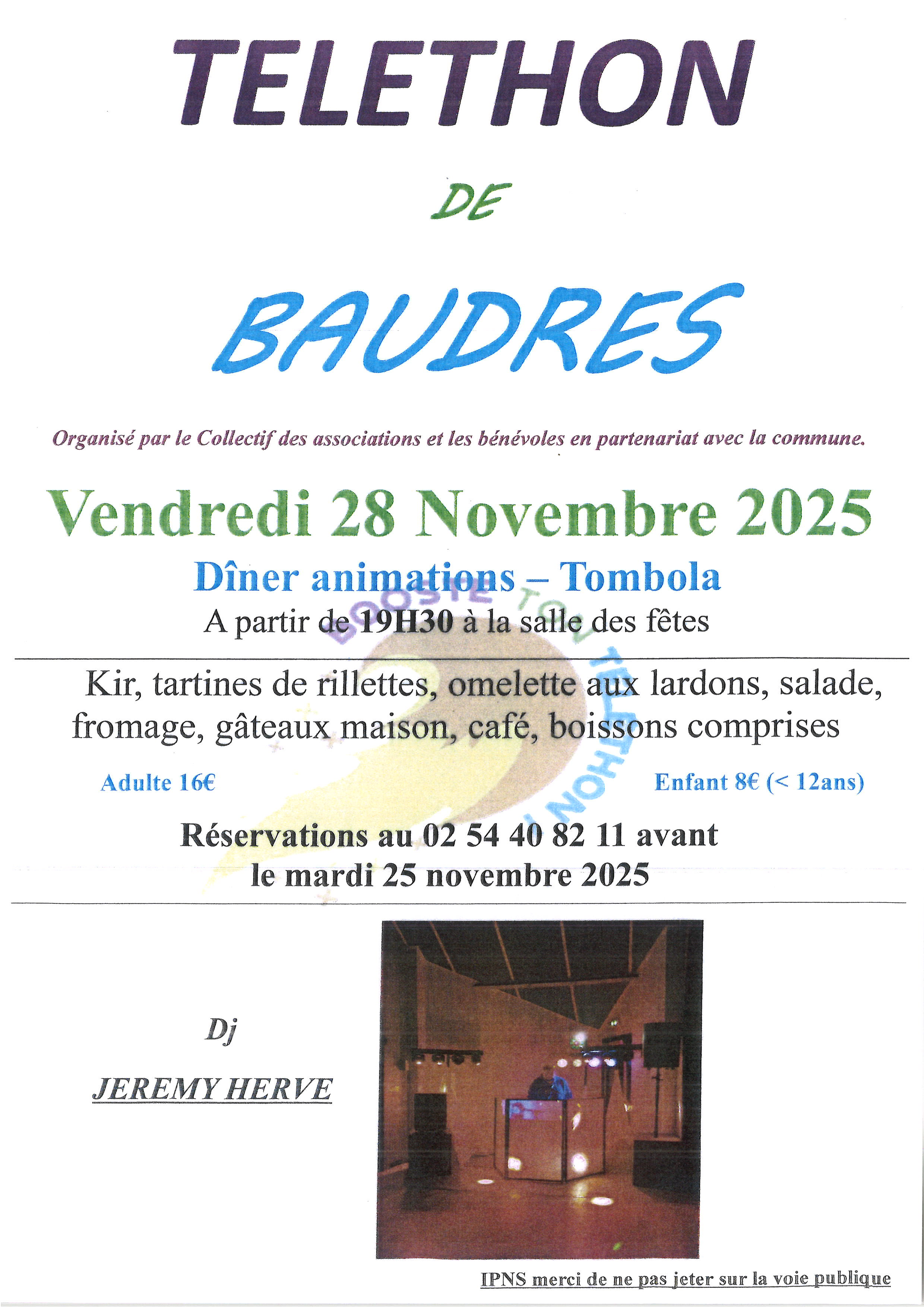 TÉLÉTHON : vendredi 28 novembre à la salle des fêtes à 19h30 Les tickets repas sont à retirer la mairie (ouverte le matin) contre un chèque à l'ordre de l'association d'animations.