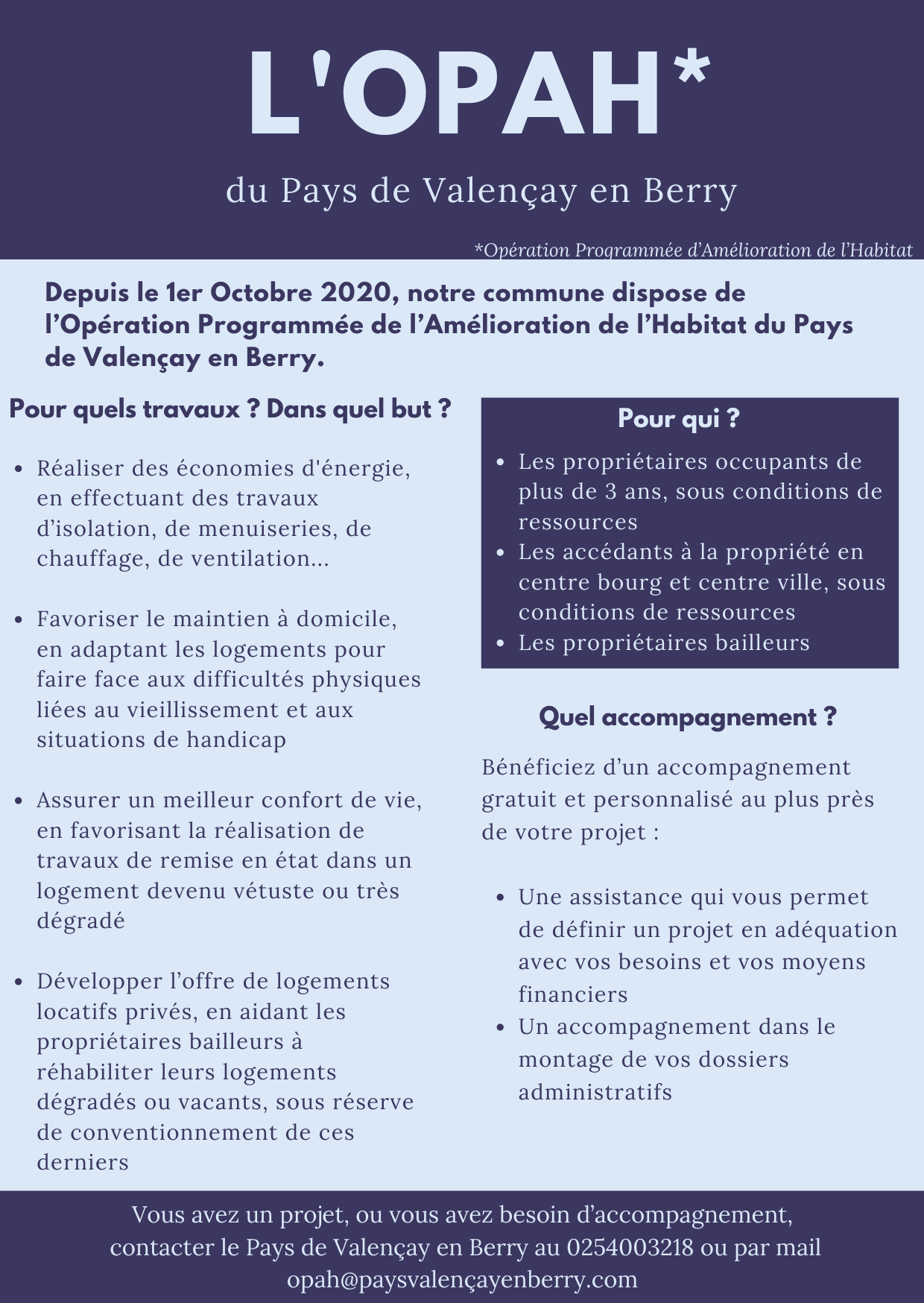 Propriétaires, accédants à la propriété en centre bourg, propriétaires bailleurs, vous pouvez bénéficier d'aides (sous conditions de ressources) pour des travaux d'économies d'énergie, d'adaptation de votre logement pour maintien à domicile, de remise en état de votre logement devenu vétuste, grâce à l'Opération Programmée de l'Amélioration de l'Habitat (OPAH) du pays de Valençay en Berry.