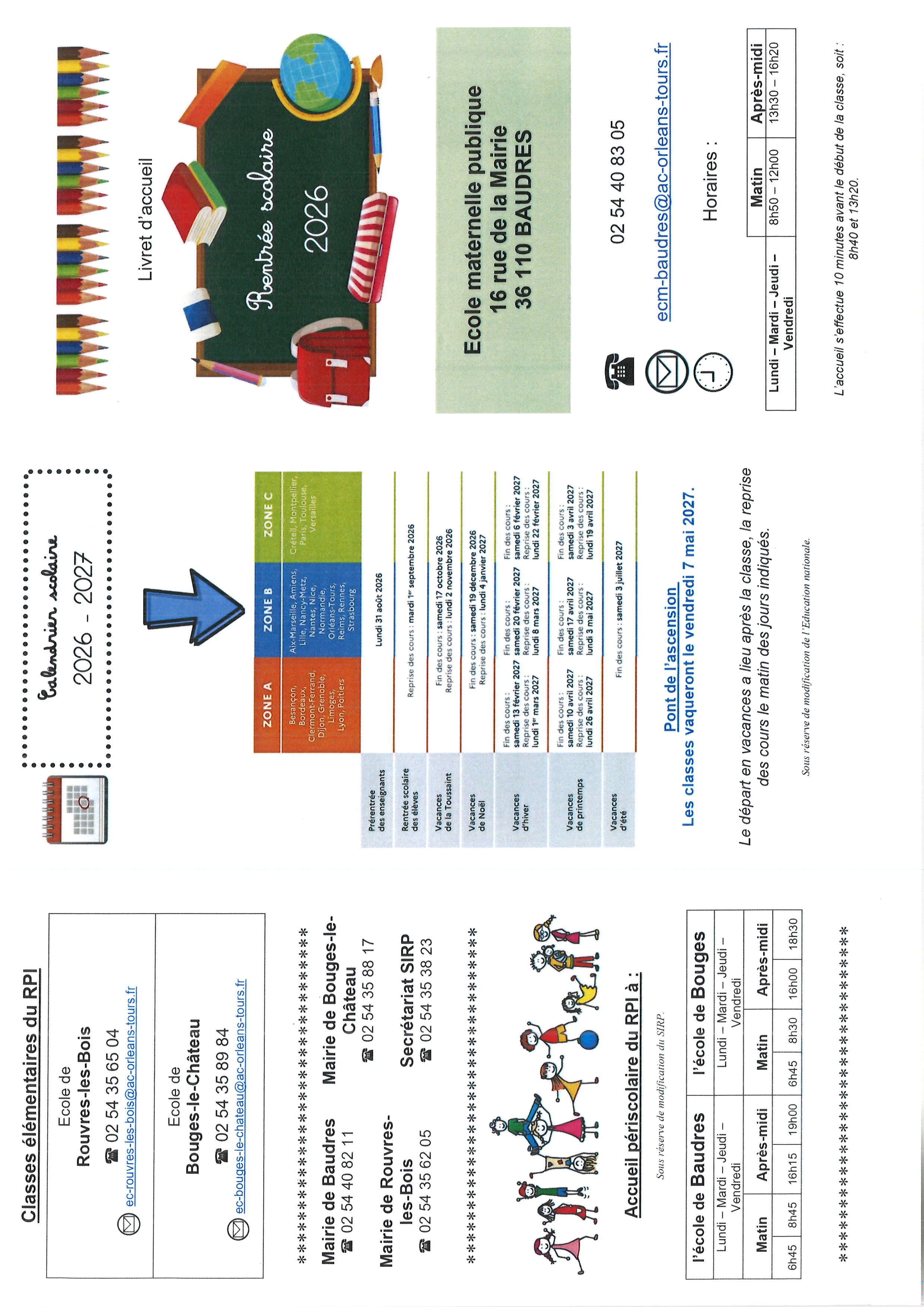 La rentrée scolaire des écoles du R.P.I. (Baudres, Bouges-le-Château, Rouvres-les-Bois) a eu lieu le lundi 1er septembre 2025 à l'horaire habituel.