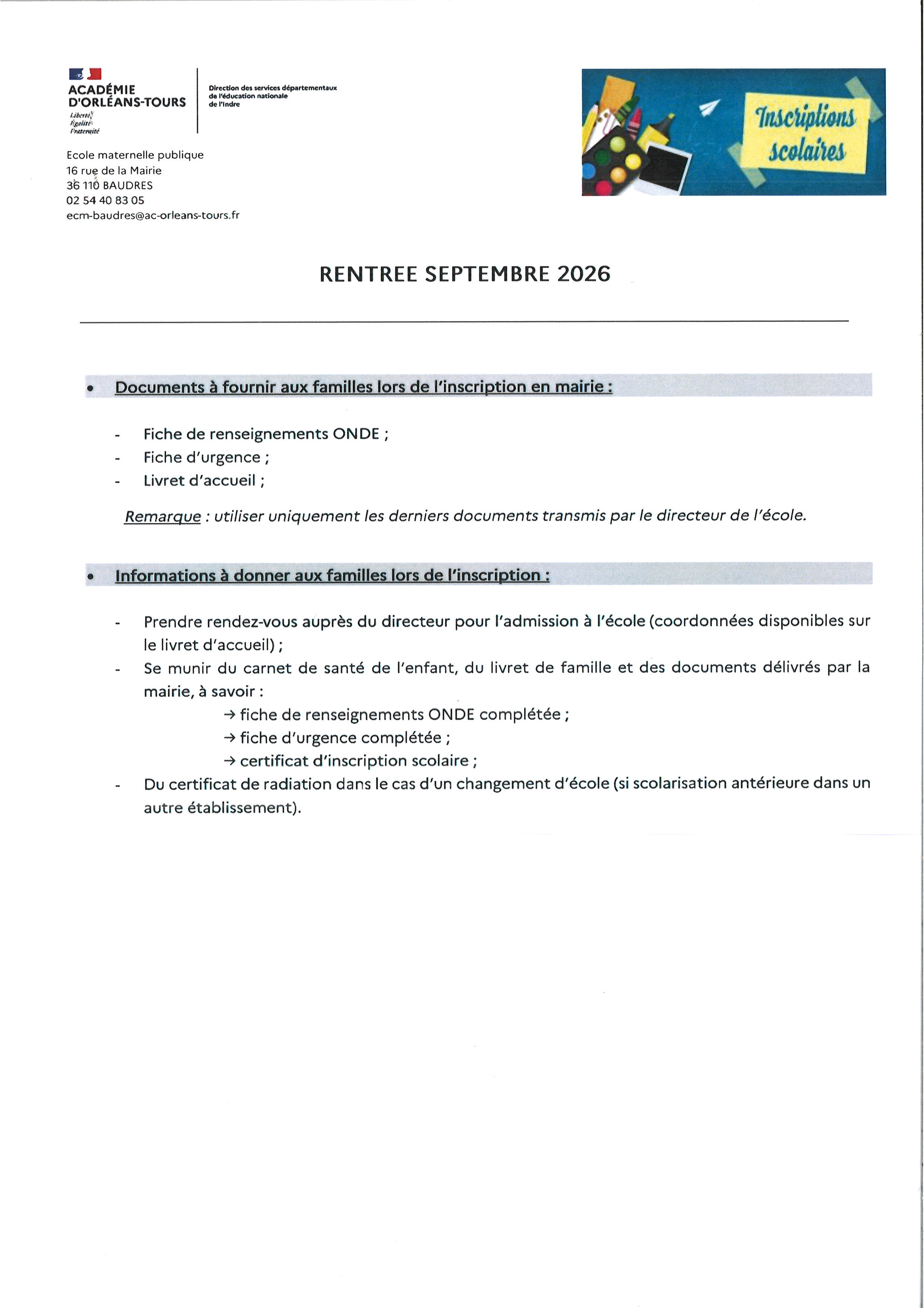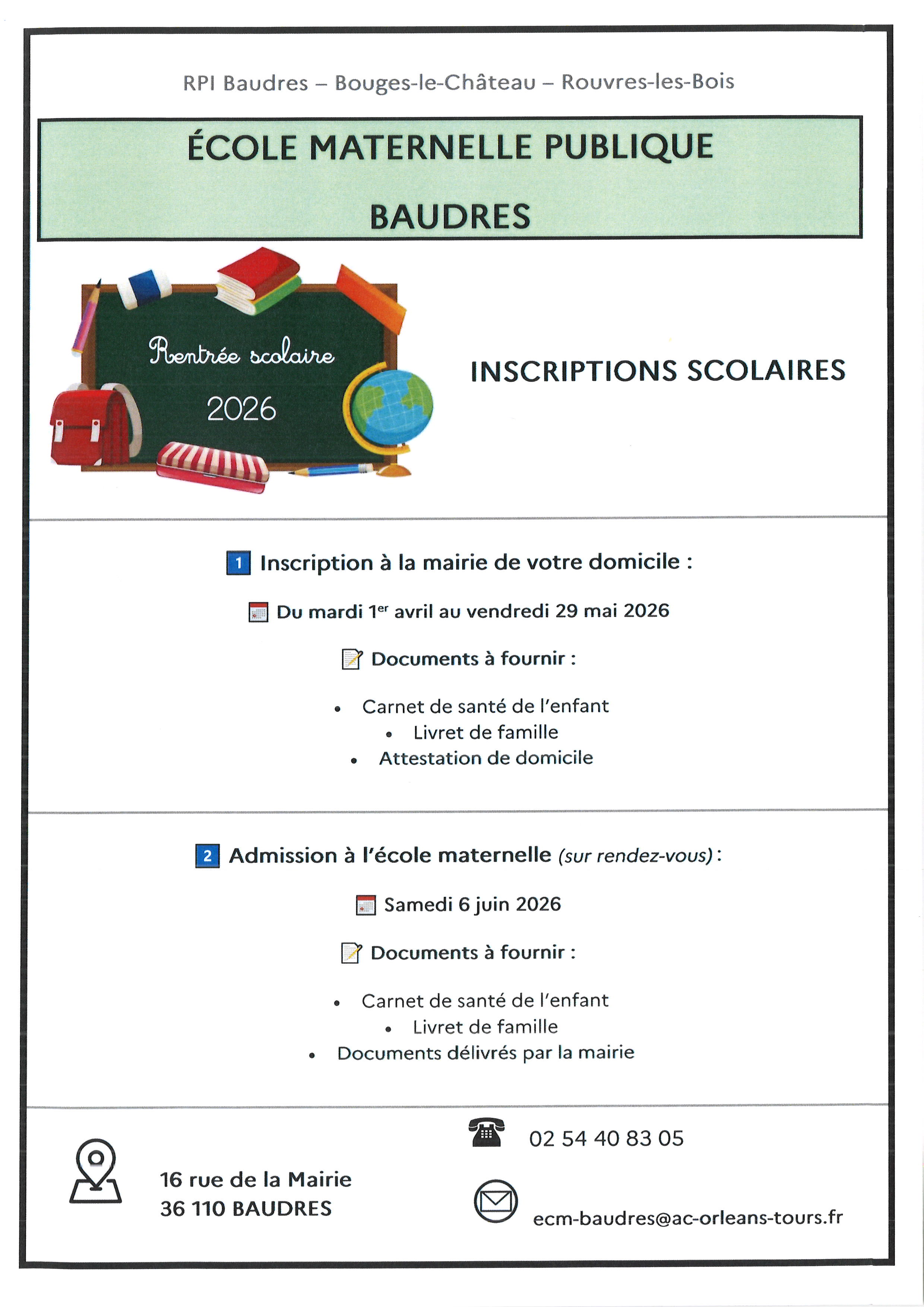 Rentrée scolaire : inscriptions du mardi 1er avril au vendredi 29 mai 2026 (affiche informations jointe)